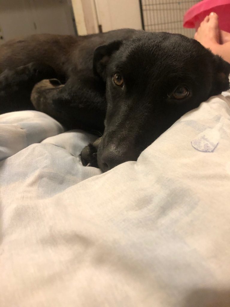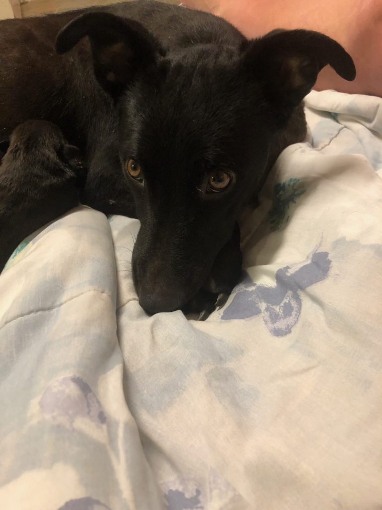 So, in the evening, I took the pups out of the pool, onto a nice soft blanket. Mama sat down on the cold hard floor! I then, gently placed the pups next to her and they started nursing. She got more comfy and actually used the blanket to rest her head.